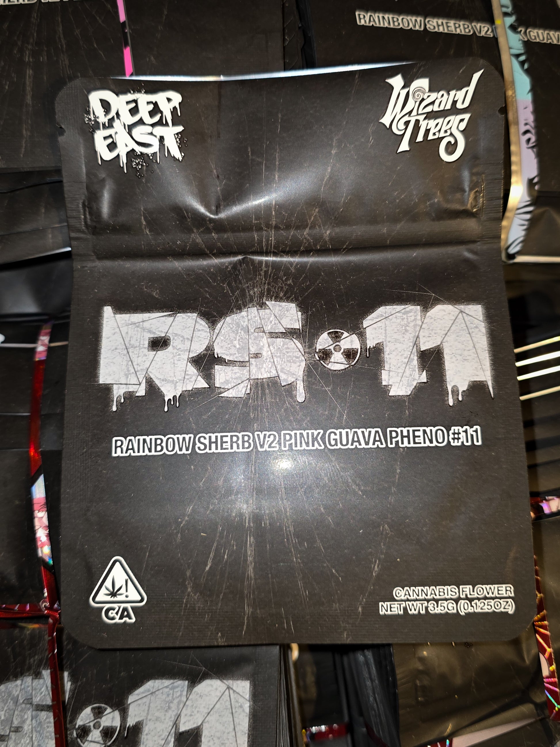 RS11 Deep East branded mylar bags for 3.5-10g storage. Authentic RS11 Deep East branding with child-resistant zipper. Premium mylar construction keeps contents fresh and protected.